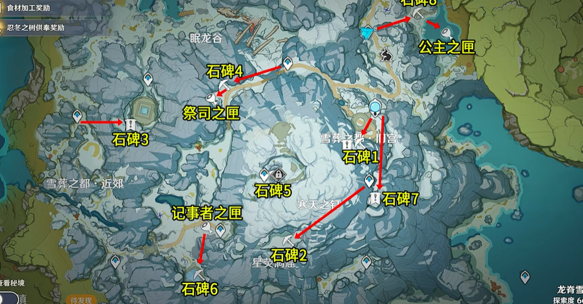 解开覆雪之国的密室,必须找齐并点亮八个石碑。这些石碑分布在龙脊雪山的不同角落,全部激活后就能开启密室,拿到里面的奖励。第一个石碑在覆雪之路传送点右侧的平台上,过去就能直接看到。第二个石碑藏在三个匣子的密室里,需要先收集祭祀之匣、公主之匣和记事者之匣才能进入。密室入口在七天神像南边的山洞里,用三个匣子开门后,进去就能找到石碑。