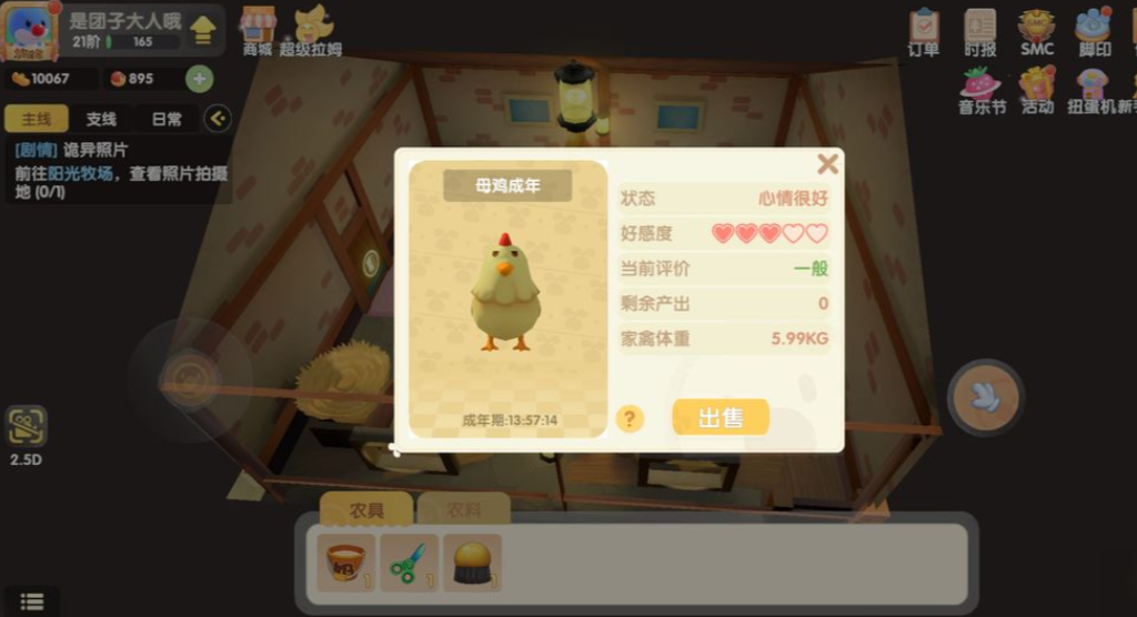 养鸭子的小伙伴要注意,刚买来的小鸭子可能会默认存在仓库里,需要手动把它们挪到家禽小屋并保存设置。饲料方面推荐种些胡萝卜放在禽舍附近,饿了它们会自己吃,省心又省摩尔豆。如果想带鸭子出门散步,同样用铃铛就能放它们出去自由活动,但记得天气变化前及时召回。鸡鸭牛羊的回收方式都一样,铃铛就是万能开关!如果任务需要带鸭子找NPC,跟着主线做到特定环节它们就会自动跟随。