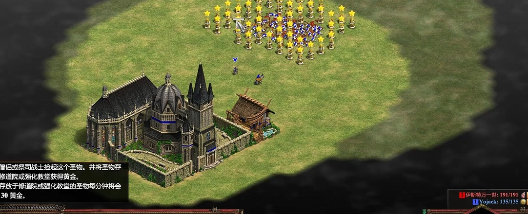 圣物是决定胜负的重要战略资源,通常分布在地图的固定位置或特定区域。圣物外观为金色雕像,由僧侣单位收集并存放于修道院中,每个修道院最多容纳5个圣物。收集全部圣物并保持一定时间可直接获胜,因此掌握圣物位置对战术布局至关重要。大多数战役地图的圣物会出现在修道院附近、高地或资源密集区,部分关卡则隐藏于敌方基地或特殊地形中。