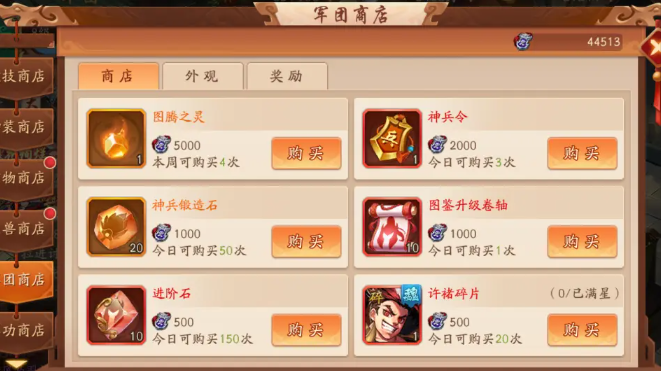 宠物商店的核心资源是战宠碎片和升星丹,合成高阶宠物虽然耗时但后期不用频繁更换。神炼石和口粮也别忽视,它们能快速提升宠物属性。巨兽商店的兵符碎片和万能碎片是刚需,尤其前期建议清空库存,后期巨兽币会贬值。军功商店的纹晶对装备强化很关键,前期选普通纹晶,后期再换高级款。军团商店的红将碎片、神器抽奖券必须每天拉满,贡献足够的话时装也别错过,能激活全体属性加成。
