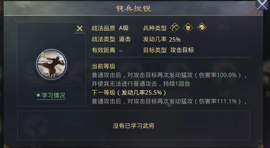 谈到具体怎么围绕加点来搭配战法,这就跟他的定位强相关了。如果你走的是全攻输出流,那么战法选择上就要追求极致的伤害加成和发动几率,击势、胜兵求战这类能大幅提升输出的战法是很好的选择,宝物也可以优先考虑带有熟虑词条的,比如熟虑滕蛇或熟虑掩日,这能有效提高主动战法的发动频率。如果更偏向于副输出或者辅助,那么战法搭配可以更灵活一些,像钝兵挫锐、掠敌之利这样兼具伤害和控制效果的战法就很适合,能更好地配合他自带的降属性效果,在削减对手攻防的同时打出可观伤害,为队伍里的其他核心输出铺平道路。