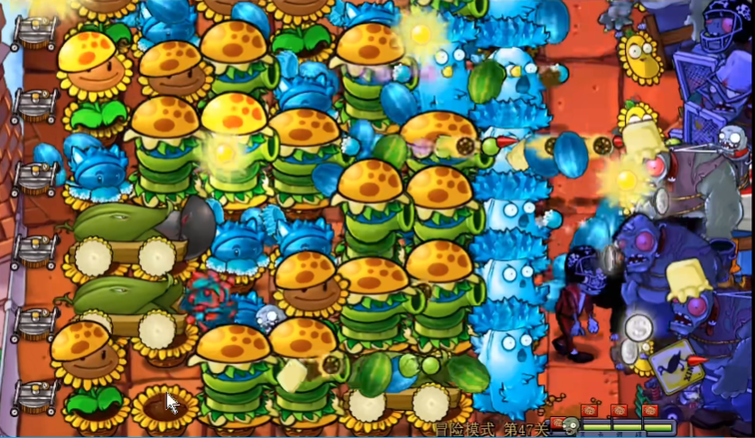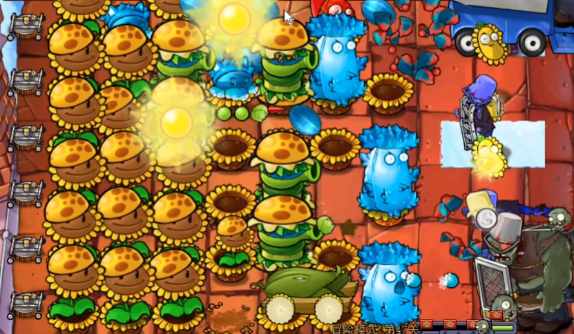 游戏进入中后期,阵容需要进行一次关键的战略转换。当阳光储备足够充足时,可以将左侧第二列的部分阳光向日葵铲除,替换为一列玉米卷香蒲。这一调整至关重要,因为玉米卷香蒲拥有穿透攻击能力,能有效覆盖和打击多条路线上的成群僵尸,大幅提升整体清场效率。这个转换的时机需要精准把握,过早会影响阳光的持续收入,过晚则可能因火力不足导致防线崩溃。