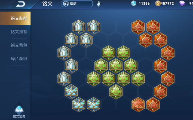 铭文的搭配服务于出装思路,强化暗信的进攻节奏与续航。一套通用的搭配方案是:红色选择红月,主要提供攻速与暴击率,使前期普攻手感更为顺畅;绿色选择鹰眼,提供必备的物理穿透;蓝色则可选择多个调和与少量狩猎的组合,调和提供的生命值与回复能帮助暗信安稳度过末世合成前的弱势期,狩猎则补充移速与攻速。这套铭文整体上强化了暗信的持续作战与机动性,使其能更高效地进行带线偷野。