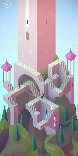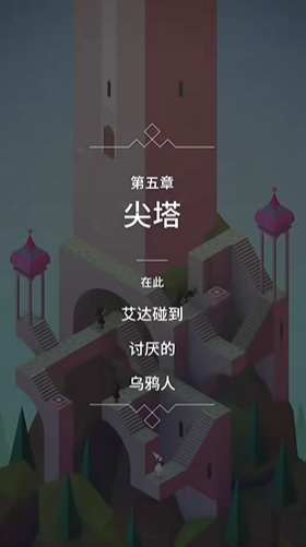 关卡起始阶段,玩家应引导艾达利用场景中的岔口和小亭子作为掩护,避开乌鸦人的视线,最终目标是抵达一个玫红色的按钮处。按下按钮后,最初墙壁上会出现一个可旋转楼梯的把手,旋转此把手能将艾达送至更高一层的另一个玫红色按钮处,此后尖塔侧壁会浮现出可供攀爬的梯子。爬上梯子并进入小门,艾达将进入一个色调不同的新场景,此时解谜的环境与要素将发生改变。