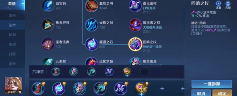 出装方面,一套兼顾冷却缩减、爆发与生存的常规顺序是冷静之靴、痛苦面具、回响之杖、博学者之怒、虚无法杖和辉月。开局购买冷静之靴对米莱狄至关重要,它能减少技能冷却,让她能更频繁地使用技能清兵和召唤仆从推塔。第二件装备优先选择痛苦面具而非回响之杖,因为面具在前期提供的属性更为全面,爆发能力也更高。接着做出回响之杖,其被动范围伤害能显著增强清线和团战时的消耗效果。