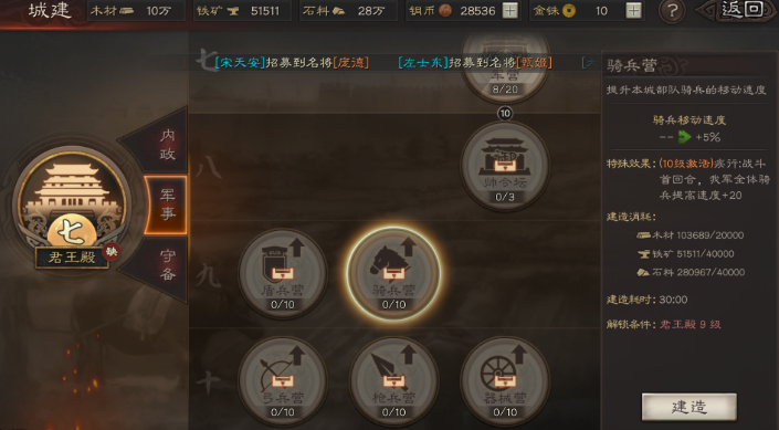 优化城建和军营等级是增加兵力的重要手段。军营是提升兵力的核心建筑,前十级每级增加单体武将200兵,后十级每级增加300兵,满级后三个武将一共可增加15000兵。军营应优先升级,尤其是在七级城后升至11或12级,八级城后再升满。征兵处的等级也影响征兵速度,满级可减少80%的征兵时间,确保兵力快速补充。