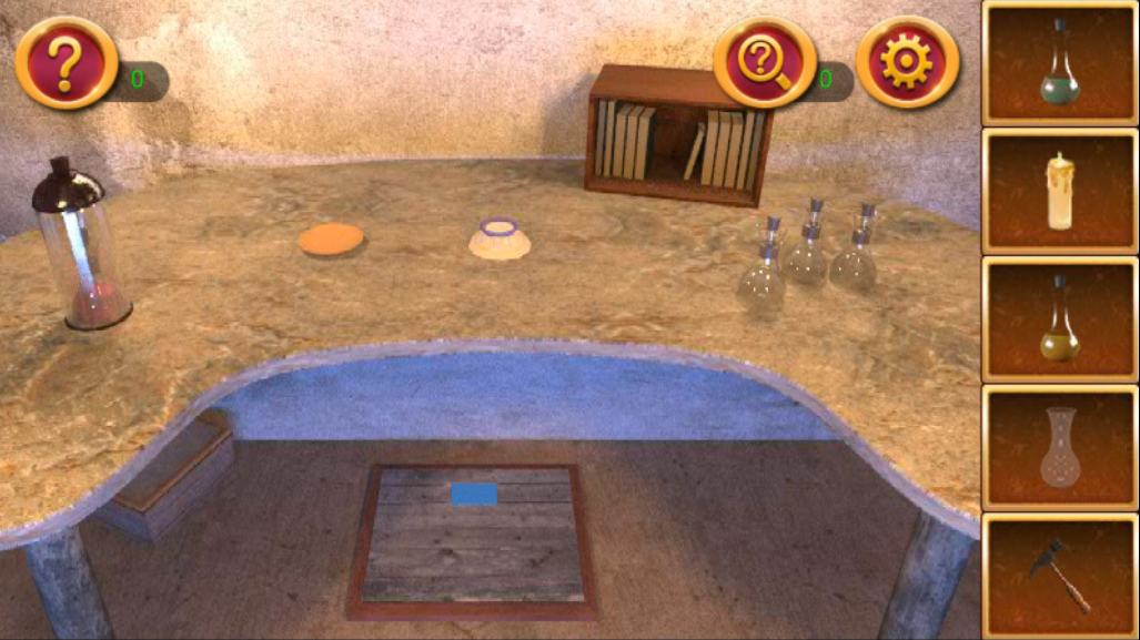 进入关卡后首先拾取实验台上的空烧杯、黄色液体瓶和蜡烛,随后在书架上取得锤子。使用锤子砸碎左侧玻璃罩获得红色液体,需注意台下左侧木箱的机关,按照特定顺序点击按钮后可取得蓝色液体瓶。这些道具将用于后续的液体混合实验。