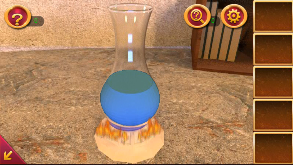 将空烧杯放置在实验台中央的淡黄色托盘上,用蜡烛点燃烧杯底部进行加热。随后分两次倒入蓝色液体,观察液体颜色变化至深蓝色后,再加入一次红色液体,最终混合液会变为特定颜色触发机关。此过程中需严格按照顺序操作,错误步骤可能导致实验失败。完成实验后密室地面暗门会自动开启,这是通往下一关的唯一出口。