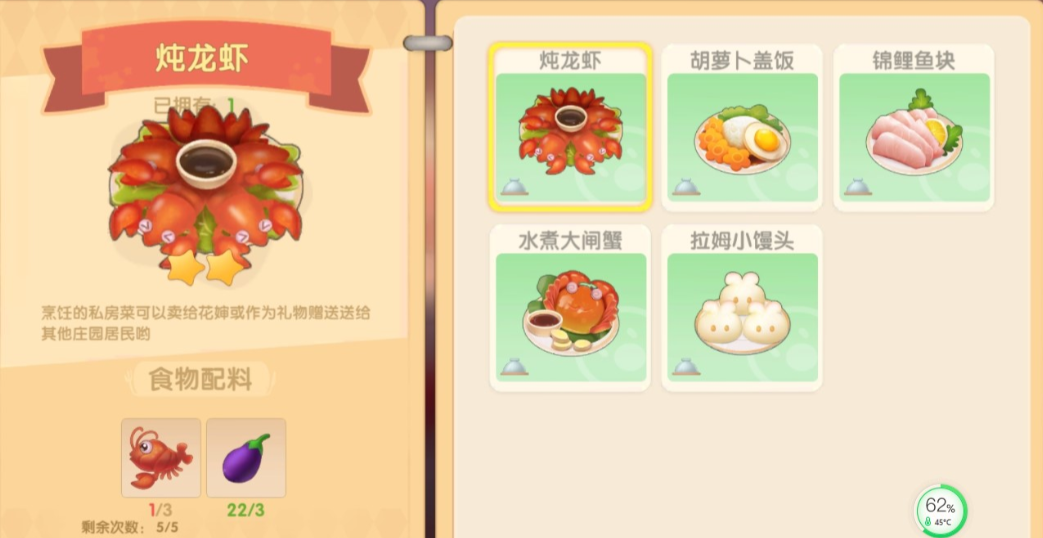 研究菜谱不仅能解锁新料理,还能获得宝贵的厨师经验值。即使配料放错,只要主料正确也能拿到少量经验,所以不必太紧张失败。建议优先尝试已知配方的菜谱,比如炖龙虾需要小龙虾和茄子,胡萝卜盖饭需要胡萝卜、南瓜、白菜和鸡蛋。这些基础菜谱能帮你快速积累经验,为后续复杂料理打下基础。