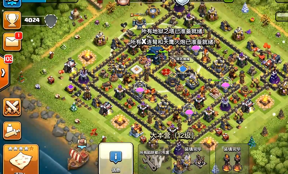 防御建筑按照射程与伤害类型合理搭配,迫击炮、法师塔等范围伤害建筑放在内层关键位置,保证火力覆盖整个阵型,加农炮、箭塔、炸弹塔布置在中层城墙缺口处,针对地面部队进行持续打击,防空火箭采用三角分散布局,避免被空军流派集中摧毁,空气炮朝向与防空火箭形成配合,有效阻挡雷龙、飞龙等空军推进,X连弩、地狱塔等核心输出防御放在核心圈外侧,形成交叉火力网,让敌方部队无论从哪个方向突破,都会承受持续高额伤害,消除防御死角,同时避免建筑扎堆被范围法术一次性摧毁。