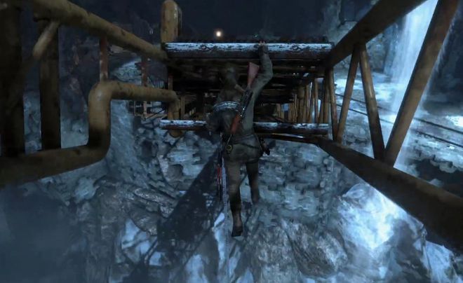 抵达古墓外部机关区后,沿树干攀爬到平台,转动绳索梁转轴,让绳索梁与对面悬崖的绳索梁对齐,用绳索箭搭建滑索,滑至对面后攀上高台。拉动左侧木杆放下悬挂木箱,跳上木箱再跳回原平台,再次转动转轴,让绳索梁与木箱上的绳索柱相对,用绳索箭连接两者。返回高台再次拉动木杆,利用绳索连接带来的延迟效果,迅速跳上移动的木箱,借木箱移动抵达悬崖另一侧,跳下后即可进入古墓遗迹通道。通道内左侧有雕刻壁画可提升玛雅知识,沿右侧通道前进,跳跃抓握崖壁凸起,注意及时应对下落,继续深入就能抵达古墓内部核心空间。